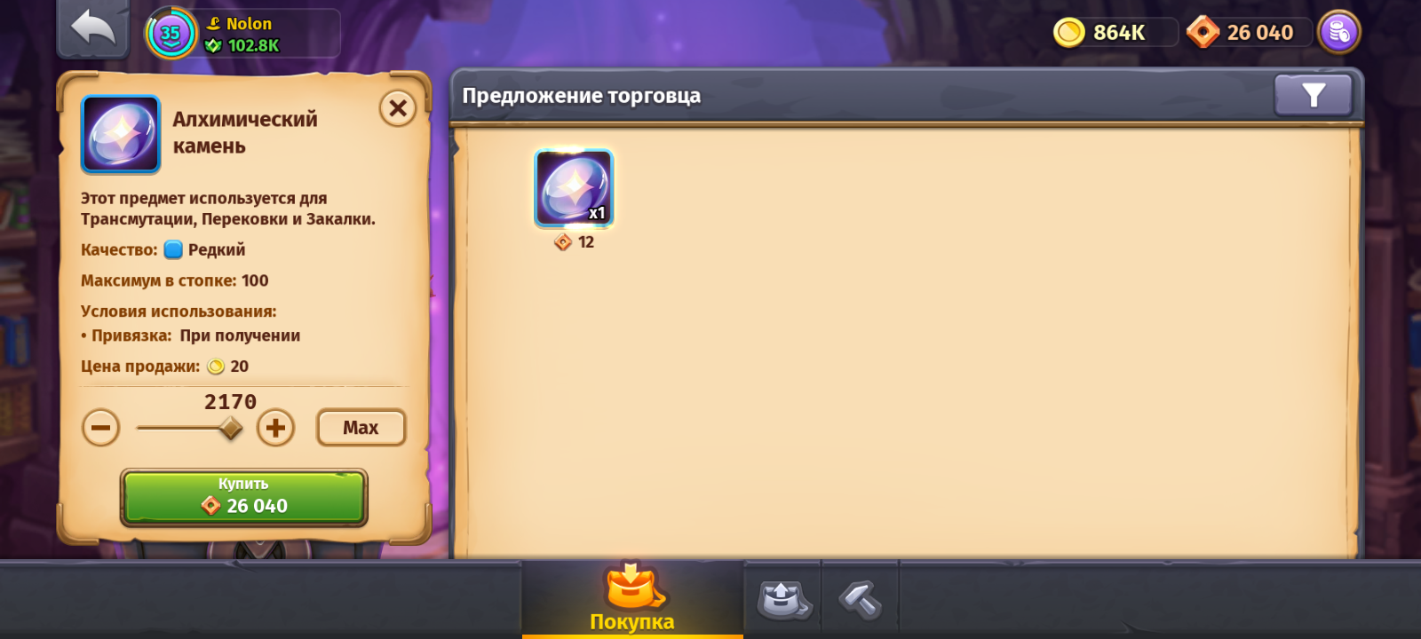 Вот сюда бы покупку белых камешков или крон хорошо бы добавить, а то я там уже всё, что хотел, купил, и валюта бесцельно копится: